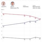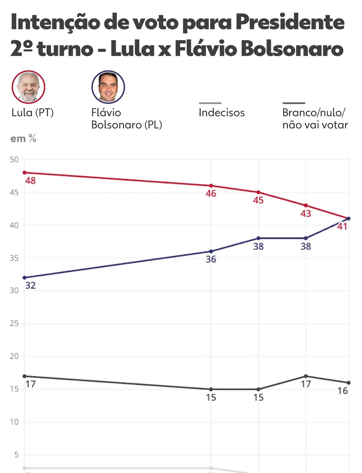 Na pesquisa divulgada em março, Lula e Flávio Bolsonaro apareceram empatados no segundo turno, ambos com 41% das intenções de voto.